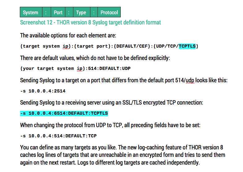 THOR version 8.44.0 supports the Syslog log transmission in an SSL/TLS encrypted form. Just set the value “TCPTLS” as protocol in the 4th position of the target definition.