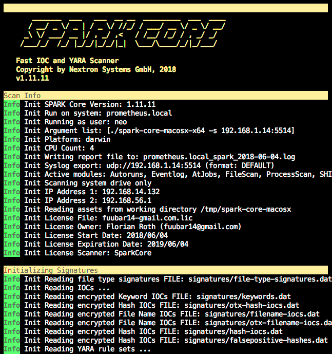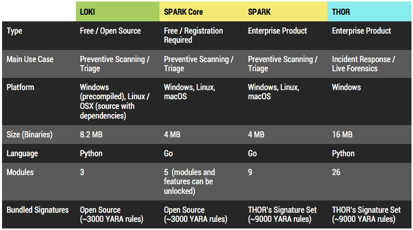 The main differences are the Open Source signature base and the reduced set of modules. It uses LOKI’s open source “signature-base” instead of the big signature set that is used in THOR and SPARK. It also lacks some of the modules, like the SHIM cache, Registry, Eventlog and DeepDive modules.
