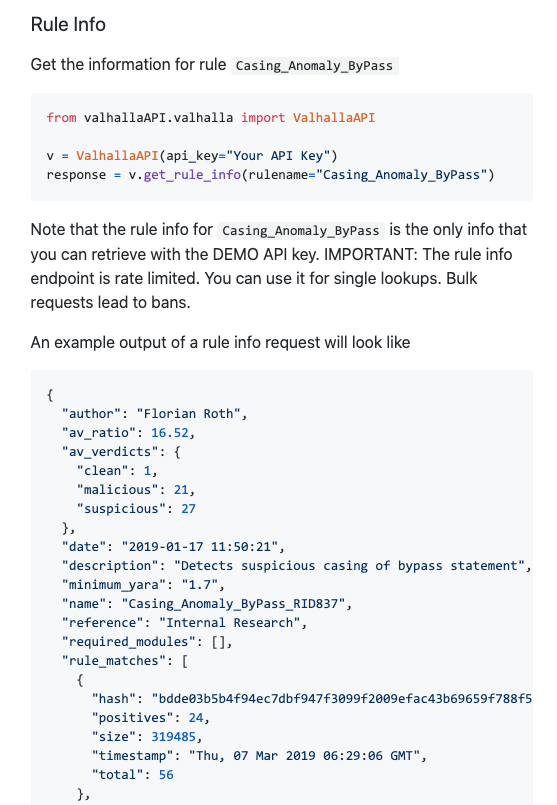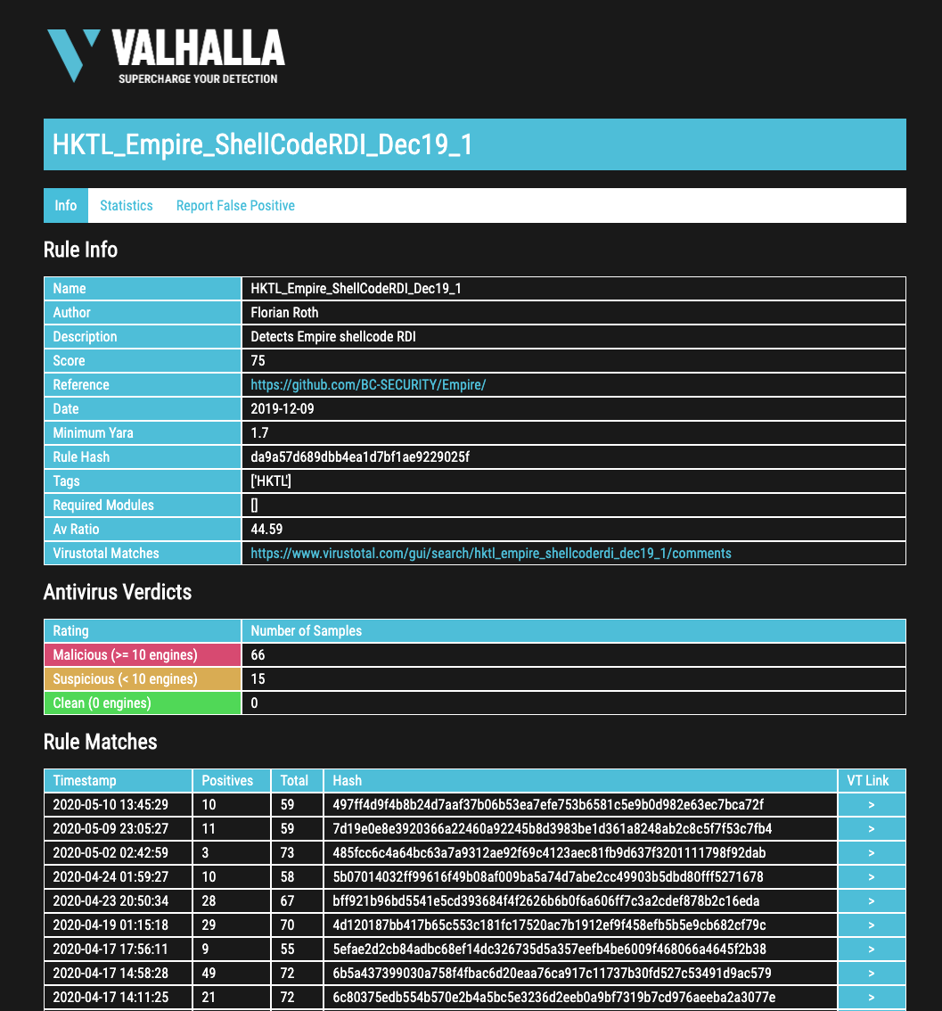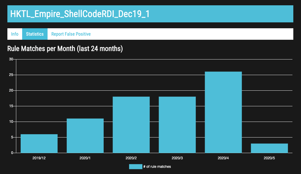 The new rule info pages allow you to get more information on a certain rule. You can find all the meta data, as well as past rule matches and previous antivirus verdicts.