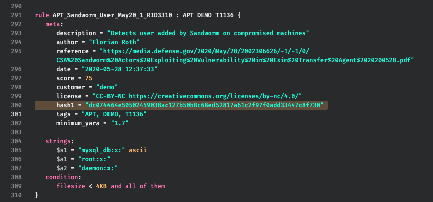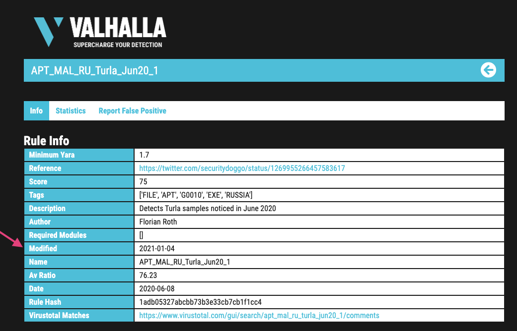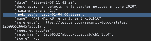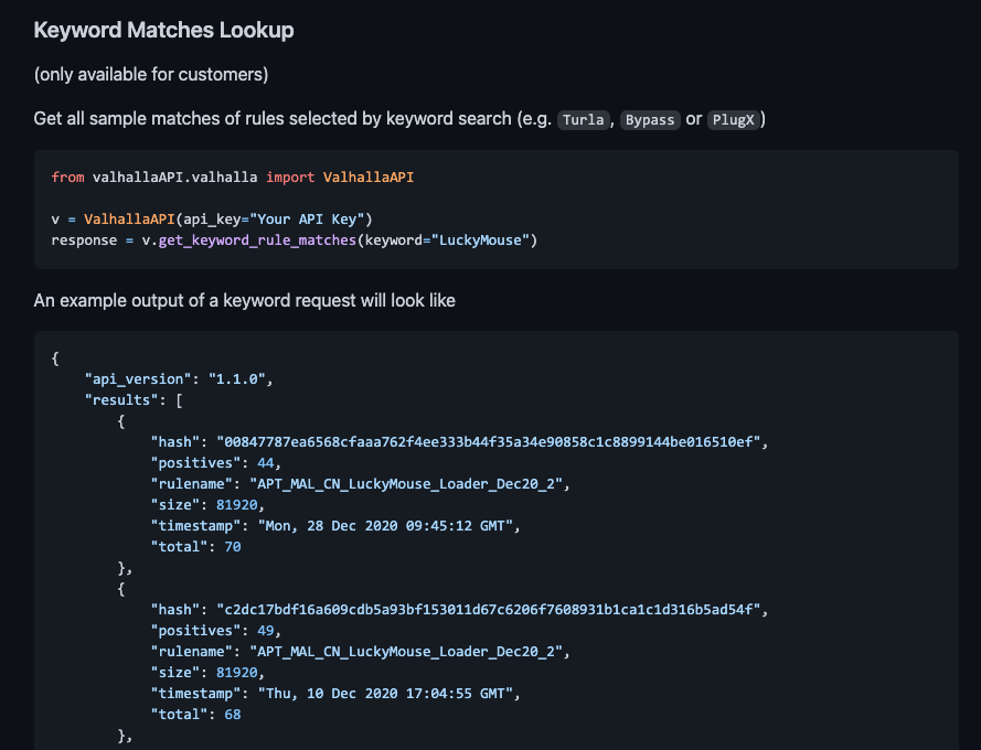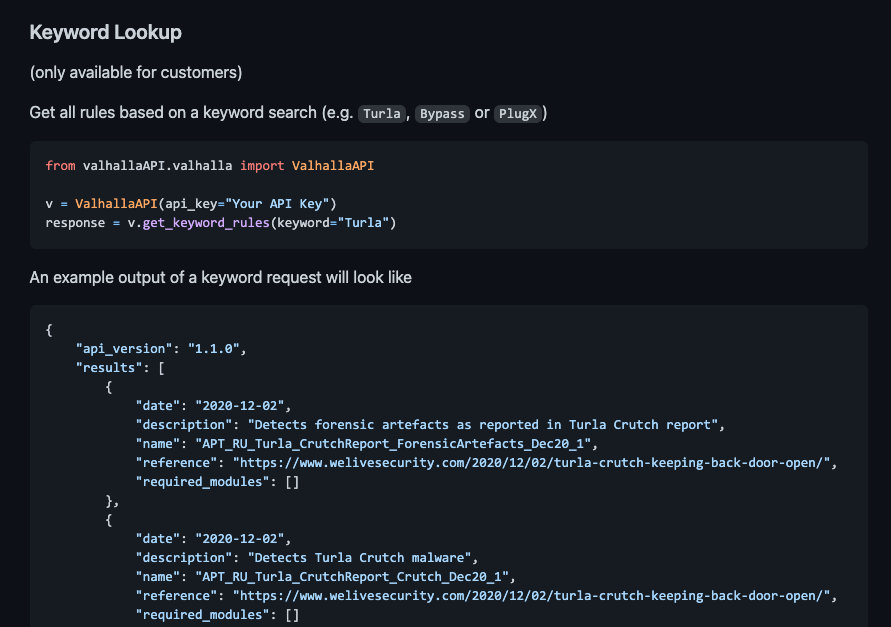 E.g. by providing the keyword “Turla”, you get a list of sample hashes on which Turla related rules matched in the past.