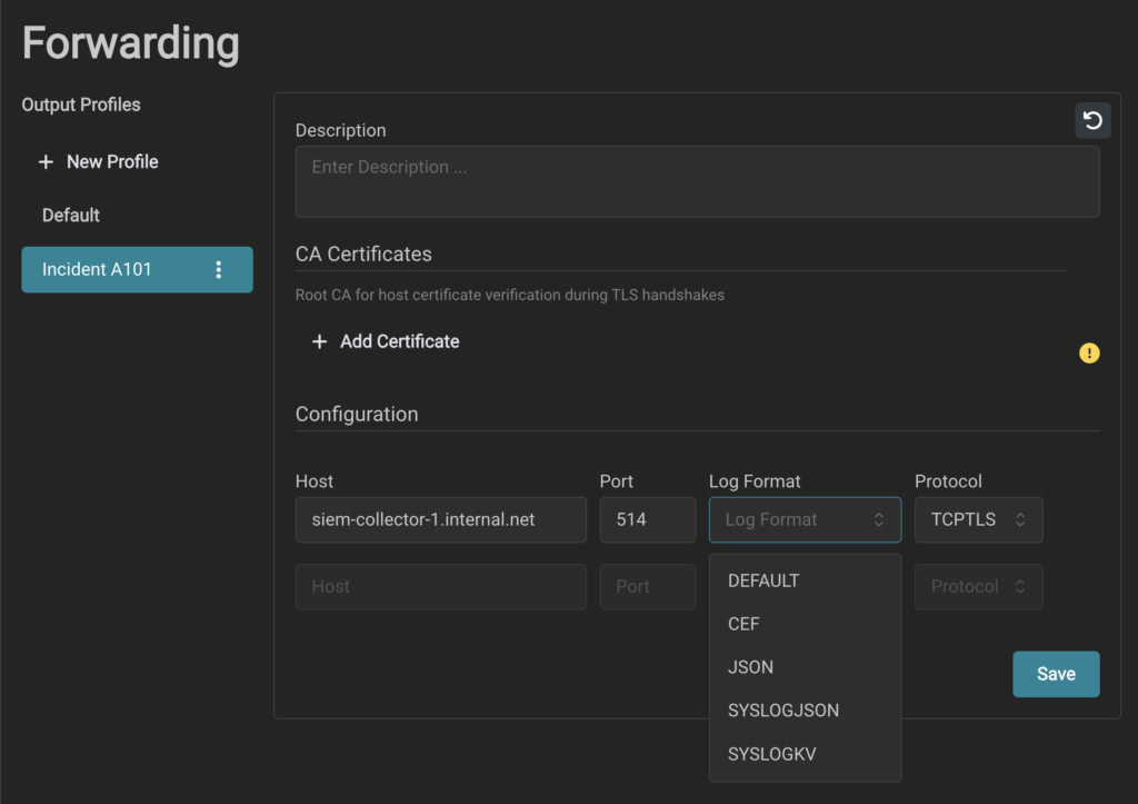 - Log format: Syslog, JSON, or CEF