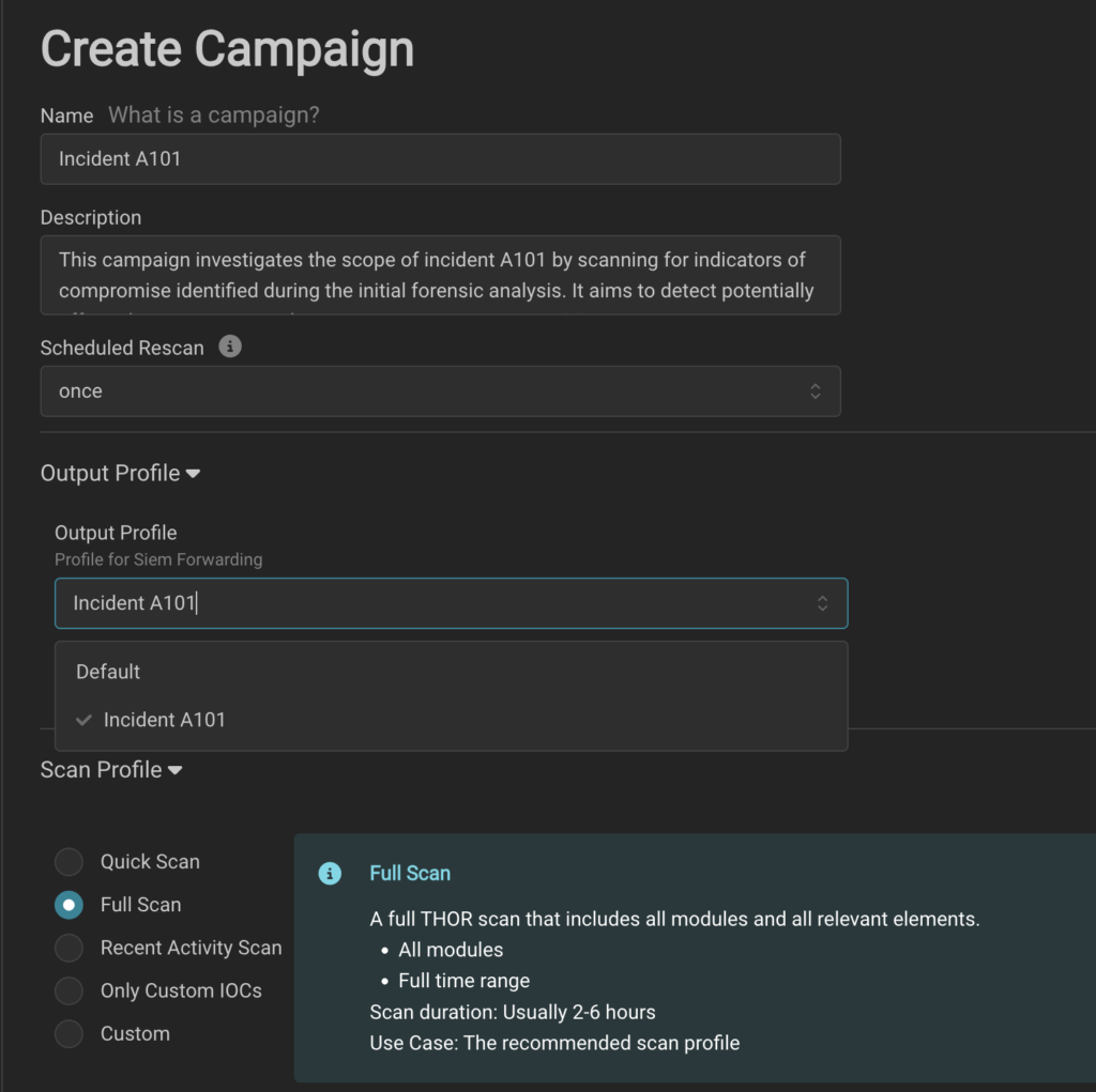 When launching a scan campaign, you’ll find a forwarding profile dropdown in the campaign configuration screen. If a default profile has been defined, it will be pre-selected automatically. This integration ensures that logs are consistently forwarded without requiring manual selection—though it’s easy to override if necessary.