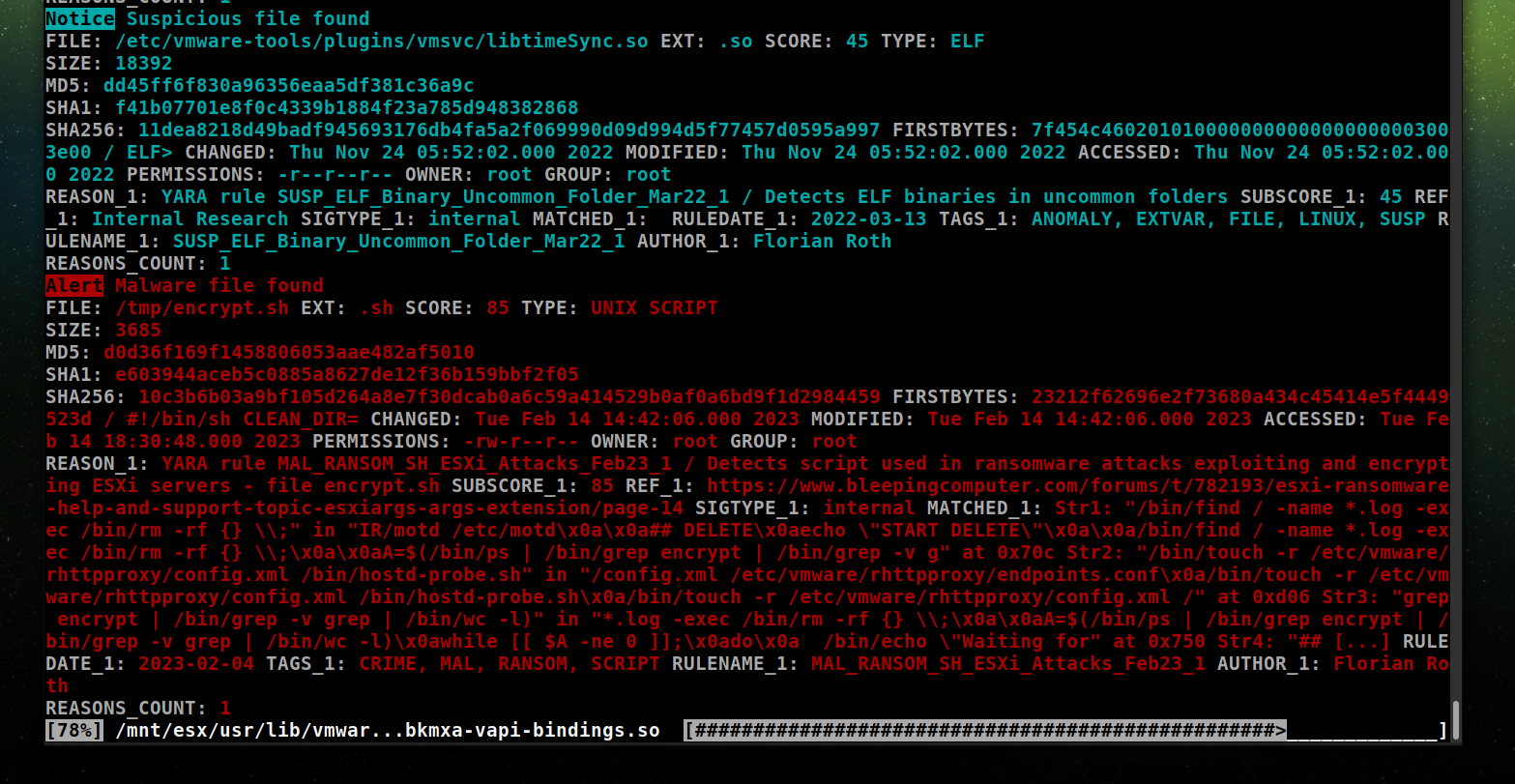 The following screenshot shows an example match on a malware found on systems affected by the ESXiArgs attacks. The rules and IOCs for this attack are available in THOR and the free THOR Lite version.