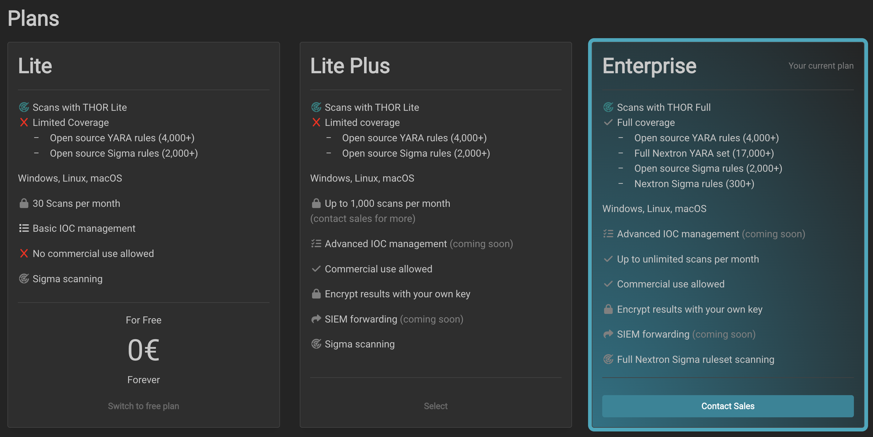 Conversely, THOR Cloud Lite is better suited for individuals, non-profits, and organizations that maintain their own set of detection rules and require very targeted and specific scans for a narrow range of threats. This makes it ideal for users who perform specialized, less comprehensive security checks.