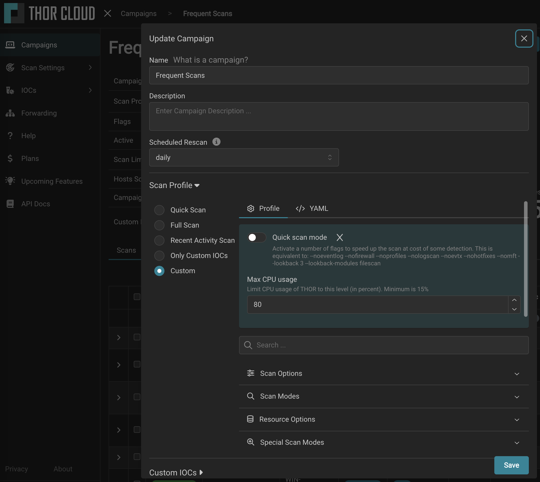 THOR Cloud simplifies ongoing security assessments through its Scheduled Rescans feature, which automatically sets up and manages scheduled tasks or cron jobs on target systems. Users can easily configure multiple campaigns with different frequencies—such as daily quick scans and weekly full scans—directly from the campaign configuration menu.